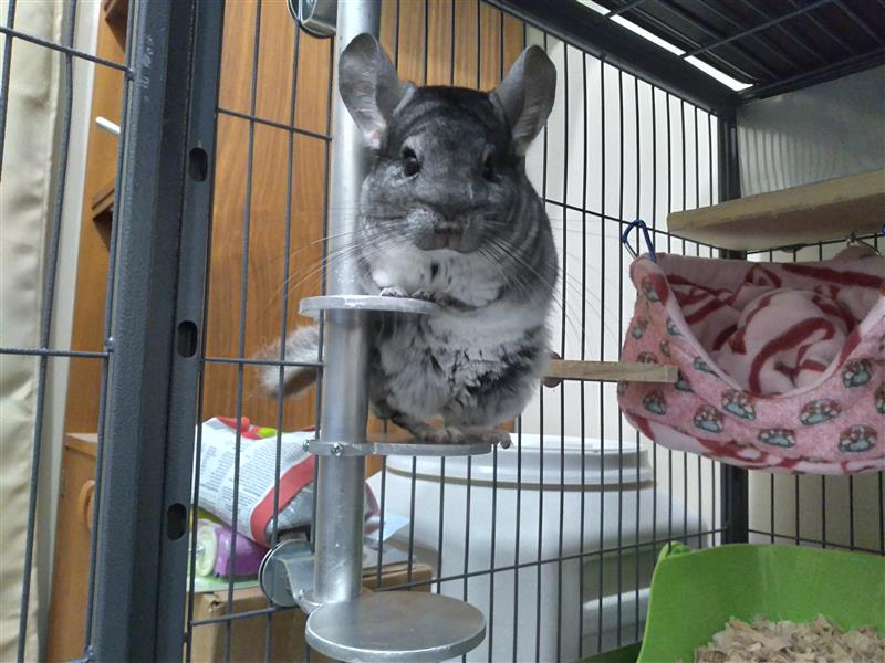 [2023-12-30] We had to be sure nothing in Nibbler’s house could harbor fungus, so everything needed to be made of metal or regularly washed fabric. One of the things she loved in her house was this hanging wooden platform we dubbed her “Tiki Bar”. We always pictured her sitting there with a Mai Tai.