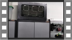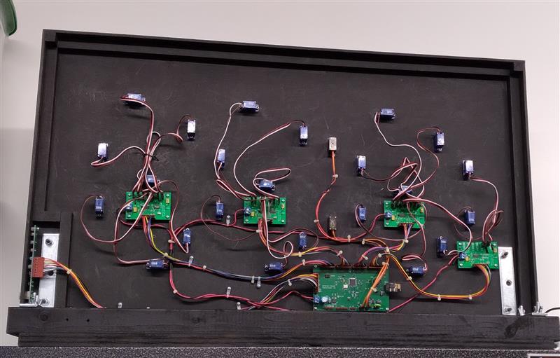 The rear panel shows all the wiring, which looks much like a small version of my vertical pinball machines! At the lower left is the control panel board. The little blue boxes are the 23 servo motors. The 4 smaller PCBs are the multiplexer boards. They mux Out the PWM signal to the selected servo motor and mux In the feedback voltage of the selected servo motor. They also switch power to their digit’s servos. The digit “hours tens” doesn’t need feedback since it only displays “1” or “blank” and has no interference problems. The colon is directly controlled by the processor board which is lower right of center as seen above. |