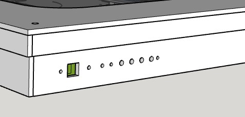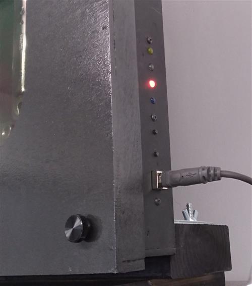 Side control panel. The top LED glows yellow when WiFi is active. Next LED down flashes green all the time when clock is in sync, red when not. The bottom red LED, here on, signifies Standby condition.