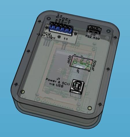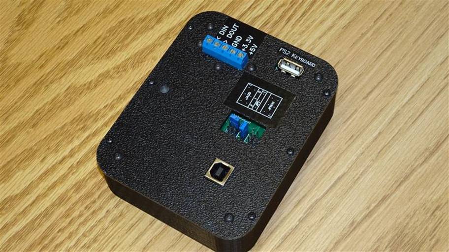 Sometimes a project will just spit out information that I can watch on a terminal. Usually though, I need to also send it commands. Therefore, I included a USB Type A receptacle on the rear panel for a PS2 type keyboard to plug in. Decoding an actual USB keyboard requires a host processor and is very involved, having done it once before. However, I have a whole box full of very small keyboards that have dual USB/PS2 functionality. PS2 keyboard data is much simpler to decode, and I use a tiny 16pin µC on the LCD controller board to receive keyboard data, convert it to ASCII and send it to the main µC via I2C bus. This way I can send and receive characters to my target project.