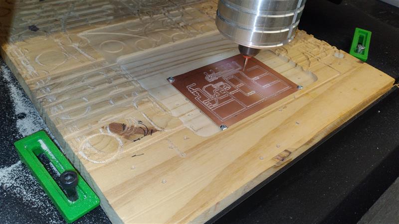 I decided to make a test fixture to verify operation before using them in another project. Fortunately I had in stock, left over from my career, an SOIC ZIF socket. This is a special, expensive socket where you lift the top, drop in your IC and close the lid. Contacts mate up with your IC leads allowing you to test the chip without soldering it to a board. I went ahead and designed and CNC’d a simple little board similar to the solar system project that incorporated this socket, 16 LEDs, programmer connector and power supply connector.