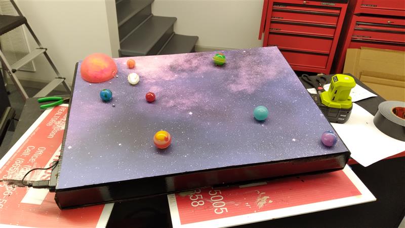 [2023-12-10] Our friend’s little boy had a school assignment to make a model of the solar system. They were allowed help, so I decided to add a little interest by making the sun glow and the planets light up sequentially. While I could have done this with a simple counter/decoder, I decided to use a cheap chinese knock-off of one of my 9S08 20pin SOIC µCs. I designed a board and CNC’d it. It holds all the electronics and the LEDs for the always-on Sun, as well as connectors that go out to the plant’s LEDs. I used a USB cord for power so that he could power it from a USB battery pack during his presentation.