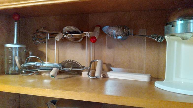 [2023-11-04] Linda has a great display area for antique kitchen utensils. To leave more space, she wanted me to make stands to raise a couple things above the shelf surface. I CNC’d wood bases with some contour and slots for the vertical acrylic that holds the mixer and pie utensil. CNCing acrylic is a little difficult, but I like the results and have some thoughts for future projects.