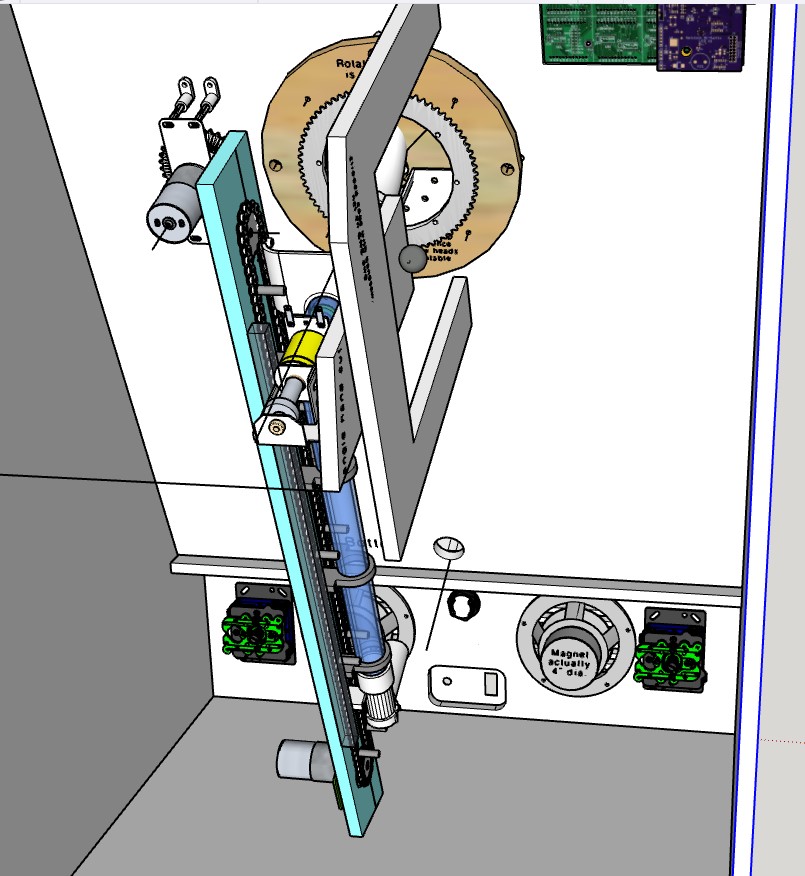 CAD view showing the two most complex mechanisms in this project. One, the rotating turret’s internal wood rotating member with it’s huge roller chain sprocket. To the left is the motor with it’s sprocket (chain not shown). Perpendicular to that is the launcher solenoid held in space by the large wood bracket structure. Two is the Ball Elevator with it’s clear blue-tinted PVC tube.