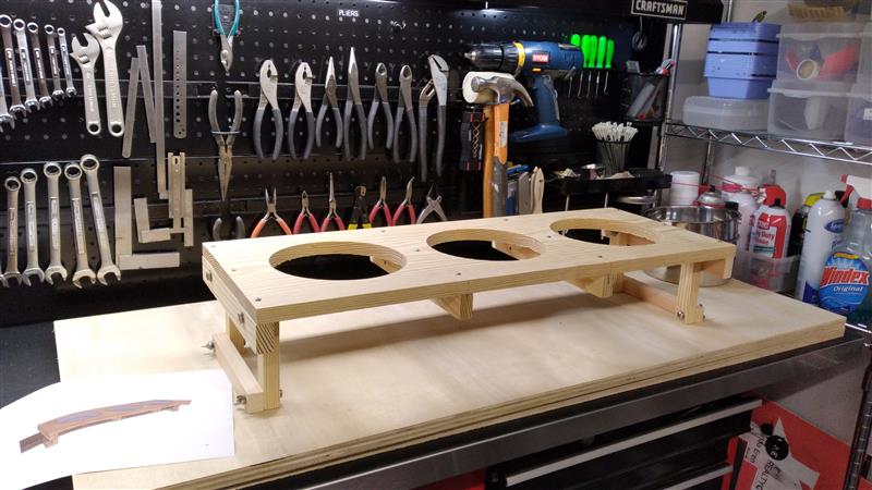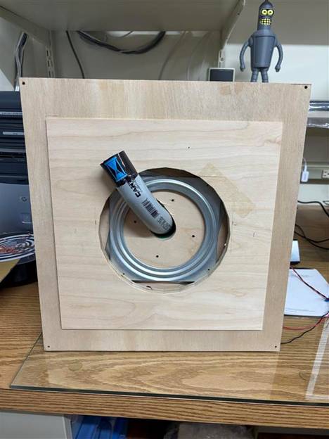 I used 1/4” plywood for the cabinet and 1/2” plywood for the base & support arms. Inside the chassis at the pivot holes in the left & right panels I put weld nuts that I had drilled for #2 sheet metal screws that held them in place. That allowed me to use 6mm knurled knobs on each side so the clock could pivot to any angle.