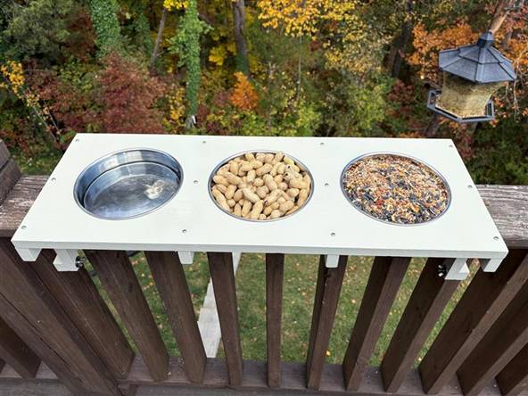 [2025-11-11] Linda wanted a new bird & squirrel feeder that would attach to our deck’s handrail. She already had the stainless pans, so I designed around those and the handrail. I used stainless hardware and Linda did multiple coats of paint to have it stand up to the outdoors as much as possible. |