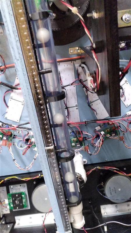 The ball elevator takes the balls to the launch tube fixed against the launch solenoid. I have another IR pair which look thru the tube to see if a ball is present. If not, software turns on the elevator motor and leaves it on until the next ball falls into the launcher, keeping up a fairly quick delivery of the balls for the player.