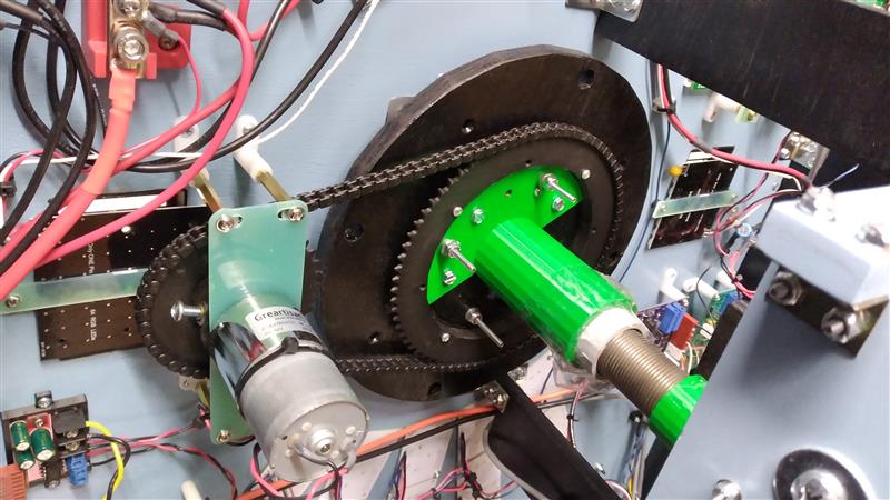 I mounted the round internal rotating turret board to a 6” lazy-susan mechanism, with the other side of the mechanism mounted to the back of the playfield. I 3D printed a 6” roller-chain sprocket with a huge 4.25” hole/opening in the center. This opening allows for a 3DP support bracket holding the 90degree PVC conduit elbow which goes thru the center. Even with the modeling, CNCing and 3D printing, in the end I had to hand contour the rotating wood opening so it would facilitate the PVC elbow’s contour as it went through.