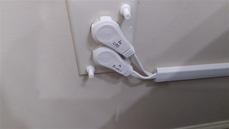 [2025-12-10] Nibbler bites everything! We let her out of her house to run around Linda’s office twice a day and there have been countless projects to protect her or the office. One situation is where 2 extension cords plug in where she can get at them. We’ve been putting something over them every time we let her out. For this project, I first put the cords themselves into surface channel. Then I designed & 3D printed a cover for the whole area. I also printed two standoffs where one end glues to the outlet face plate and I threaded the other end for screws. She nibbles at it but at now she can’t get shocked. |