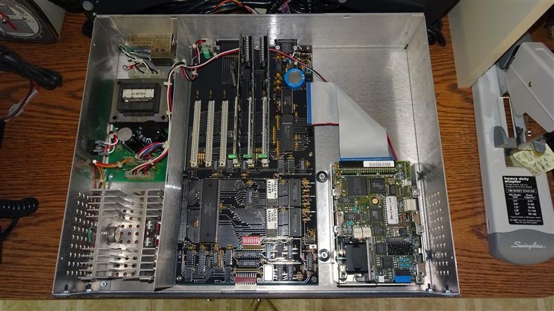 As you can see from the internal photo of the main unit, the recorder, the motherboard had the 68000. It also had 6 slots where communications boards could be plugged in. Each of these bds. had a 6502 µP, RAM, EPROM & and RS485 transceiver. This would create one 125Kbaud bus and would translate into one user, either dictate or transcribe. I used the fact that the 6502 really only needed access to memory during half it’s bus cycle to create dual ported RAM using only standard SRAM. The 68000, then, could sneak in during the unused part of the bus cycle and access each plug-in board’s RAM. This access was therefore transparent to both processors and allowed audio and control data to flow through buffer and handshake flag constructs I set up in RAM.
