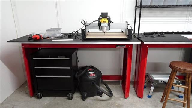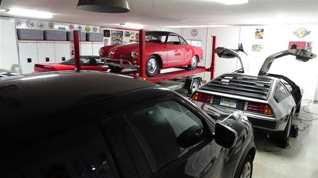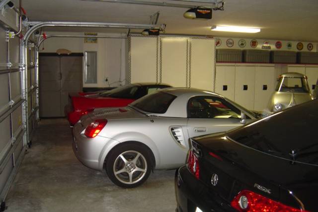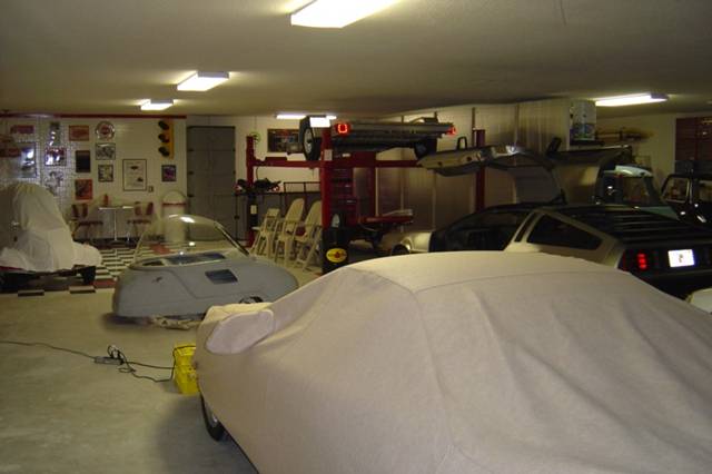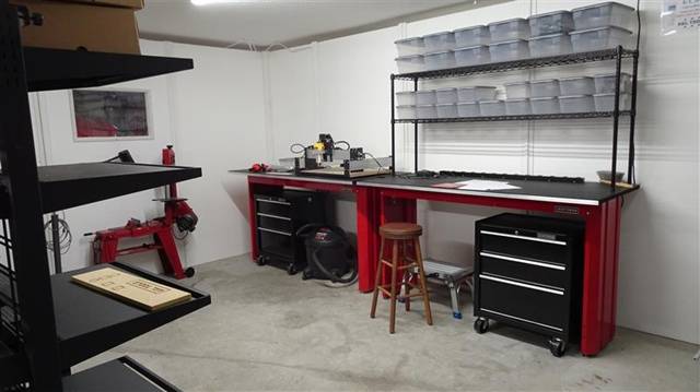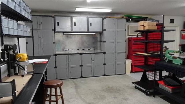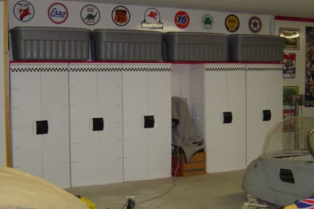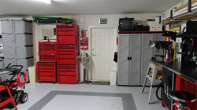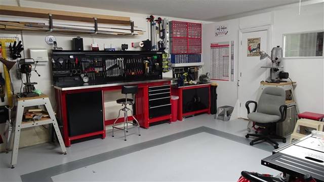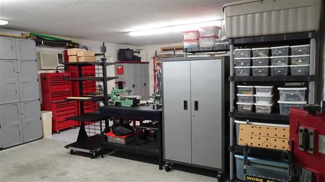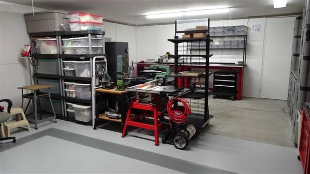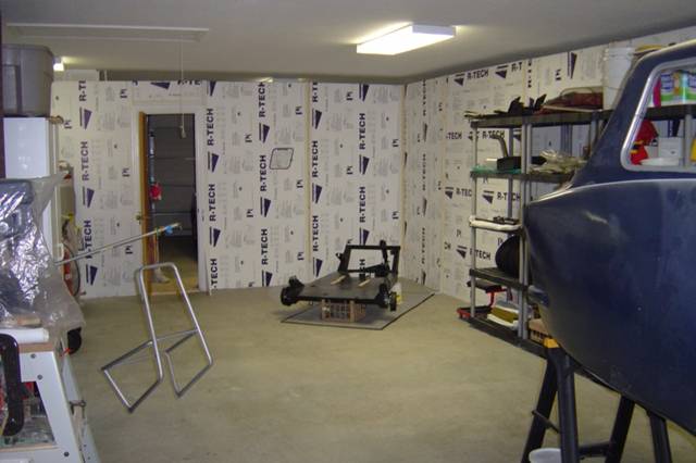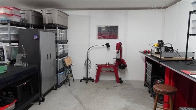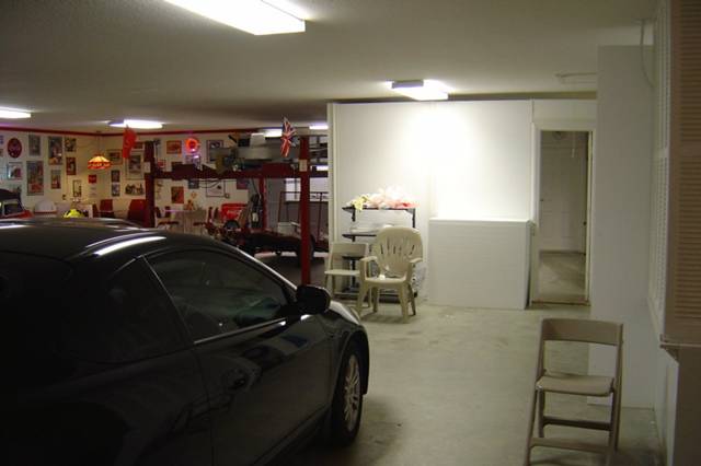 Shop Area In the rear part of the garage, we use 2” thick 4’ x 8’ styrofoam panels and standards we custom made to wall off over 500 sq.ft. to create our shop area. There’s a through the wall A/C unit to keep this area usable in the hot Florida weather. |