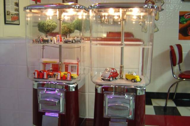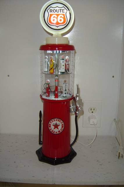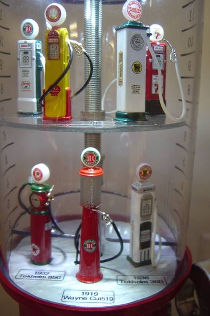 These are gumball machines I made into diorama/curio displays. Below are twin square-shaped machines. The curio to the right started out as a gumball machine in the shape of a visible gas pump. Like the others, I modified it & added illumination. I used it to display a collection of tiny Vitesse 1:43 die-cast gas pumps. |